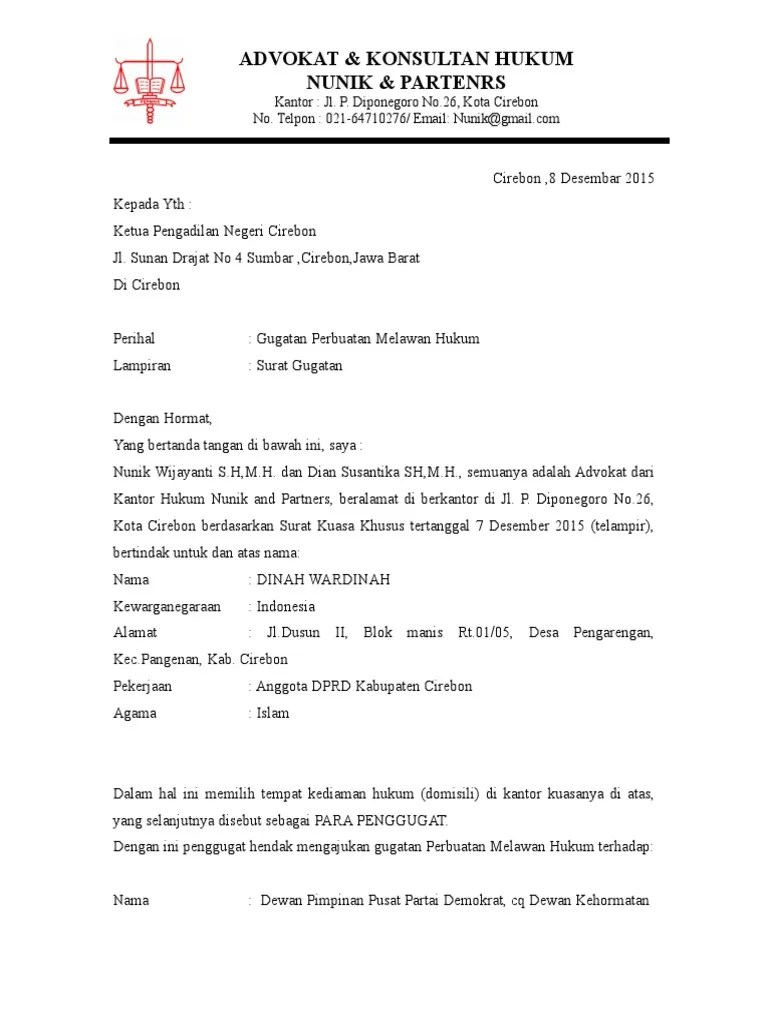 Pihak yang mengajukan gugatan (biasanya advokat/pengacara) identitas penggugat; Berdasarkan surat kuasa khusus pada Gugatan biasanya dilakukan oleh seseorang atau lebih yang merasa haknya telah dilanggar, namun pada sisi lain orang yang melanggar hak orang lain tidak bersedia memenuhi permintaan tersebut, baik secara sengaja maupun karena bersikeras tidak … 22.06.2019 · the collection of images contoh surat gugatan perdata perbuatan melawan hukum kasus tanah that are elected immediately by the admin and with high resolution (hd) as well as facilitated to download images. Edi rosandi, s.sos., s.h., m.hum, advokat pada law firm mahdi & associates, beralamat di wisma n.h.